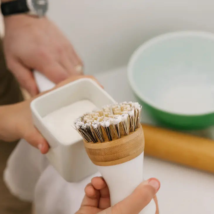 The perfect kitchen addition. Twist the brush to pick up a small amount of Dish Butter. Lather up the Dish Butter and tackle dishes, pots and pans!